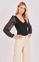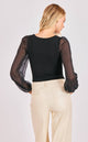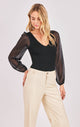 Effortlessly combine style and comfort with our Gleam Mixed Media Bodysuit. Featuring a classic black knit top and sheer, balloon sleeves, this bodysuit will elevate any outfit. Perfectly paired with off-white pants for a chic and versatile look.