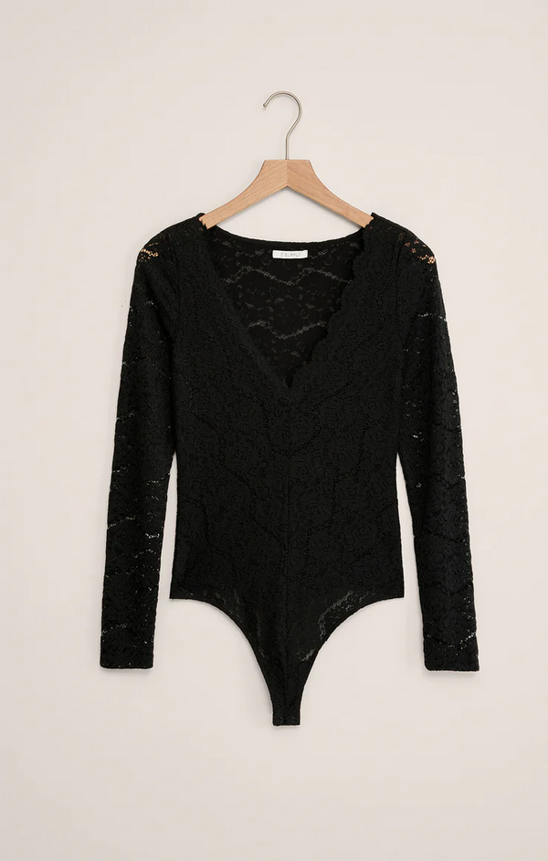 Designed by Z Supply in stretch floral lace with a scalloped neckline, this fitted bodysuit is equal parts sultry and sophisticated. With its long sleeves and streamlined silhouette, it’s the piece you’ll turn to for nights out, layered looks, and everything in between.