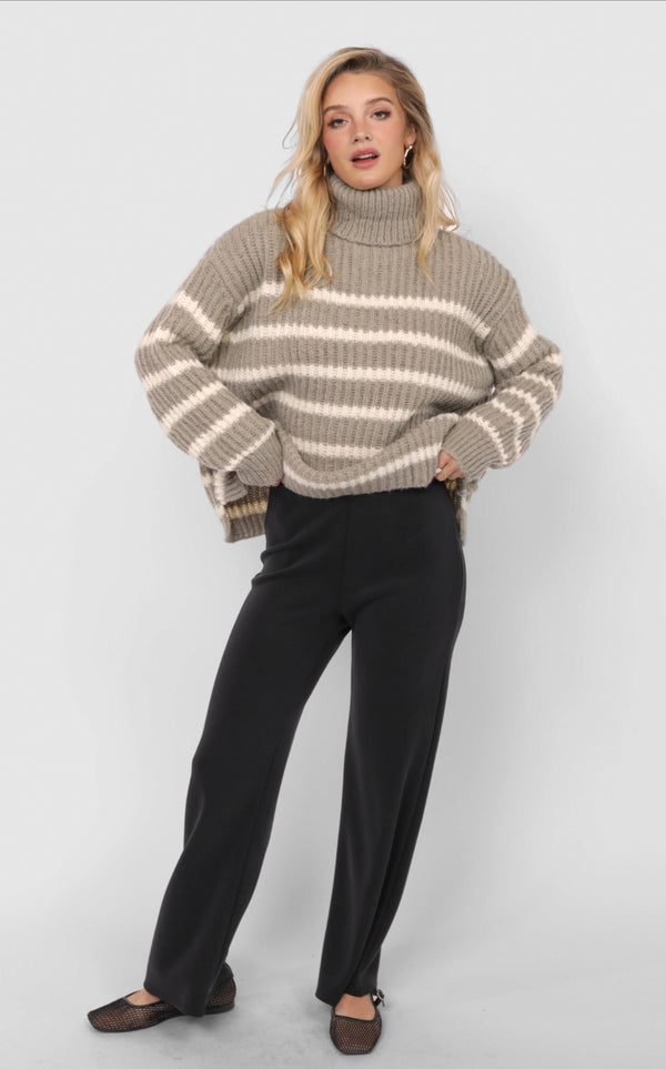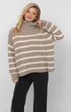 The Aki Turtleneck Striped Sweater features a classic horizontal stripe design and a cozy turtleneck, making it a must-have for cooler temperatures. The knit fabric not only adds texture but also provides warmth and comfort. With a stunning Moss & Ivory color combo, this sweater is the perfect combination of style and softness.