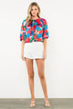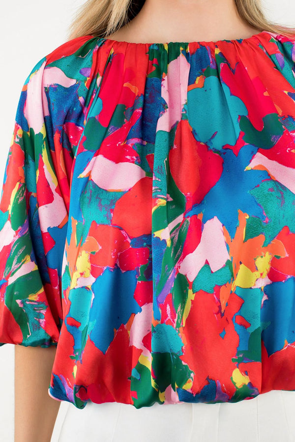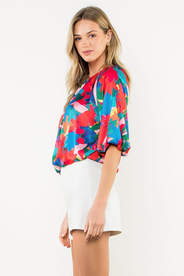 Elevate your wardrobe with the Azara Top from THML. This statement top features vibrant abstract print, paired with balloon sleeves for a touch of drama. Perfect for adding a pop of color to any outfit.