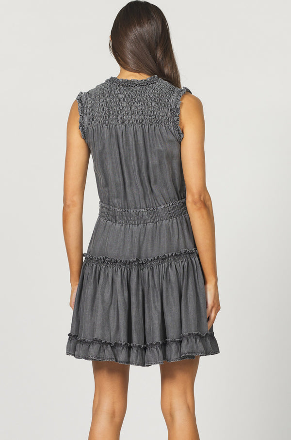 Effortless elegance in the Melodie Dress in Ash, a sleeveless masterpiece featuring delicate ruffle details and a relaxed fit, crafted from 100% tencel for ultimate comfort and breathability.