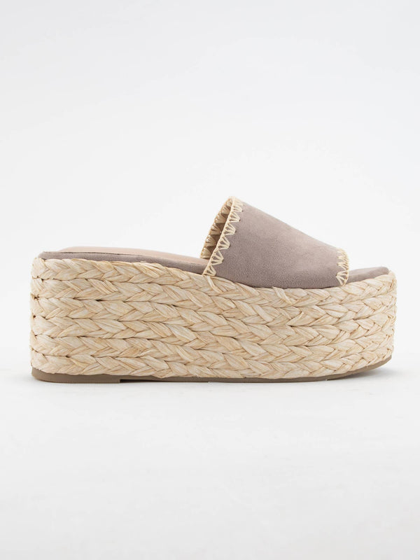 Step up your shoe game with these bold platform sandals! The blanket stitching and faux suede leather add a playful touch while the espadrille wrapped wedge heel gives you a comfortable lift of 3.25". Don't forget the chunky platform, standing at 2.8", perfect for a fun day out!