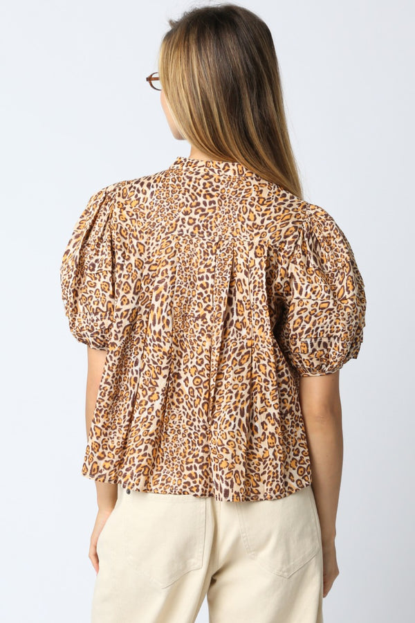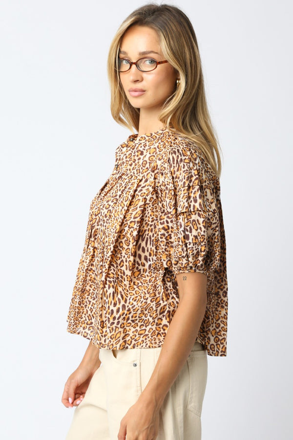 Unleash your wild side with our Greta Leopard Top. This woven top features a flattering pleated front and a stylish button down. The bubble sleeves add a playful touch while the warm colors make it perfect for any occasion. Own the room with this medium length top!