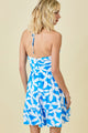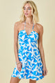 Indulge in a tropical getaway with the Leia Mini Dress. The vibrant blue and white pattern, along with the tropical floral print, will transport you to paradise. The halter neckline and V neck add a touch of elegance, while the tiered skirt and zipper closure provide convenience. You'll love the lined interior for added comfort and style.