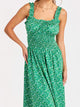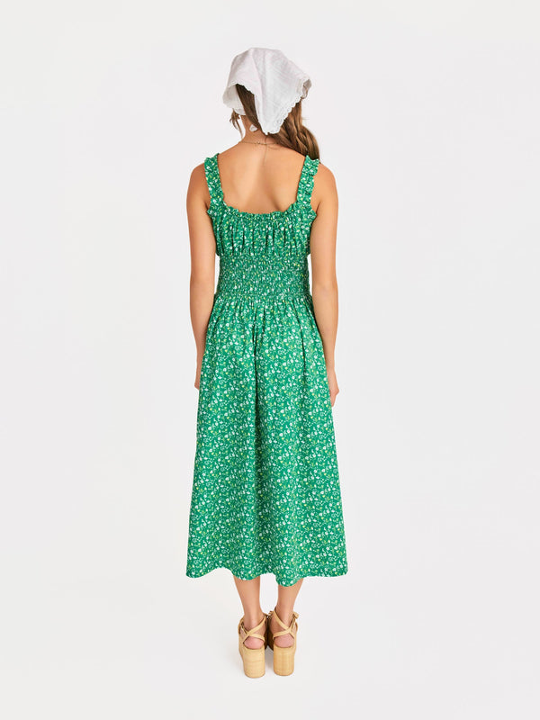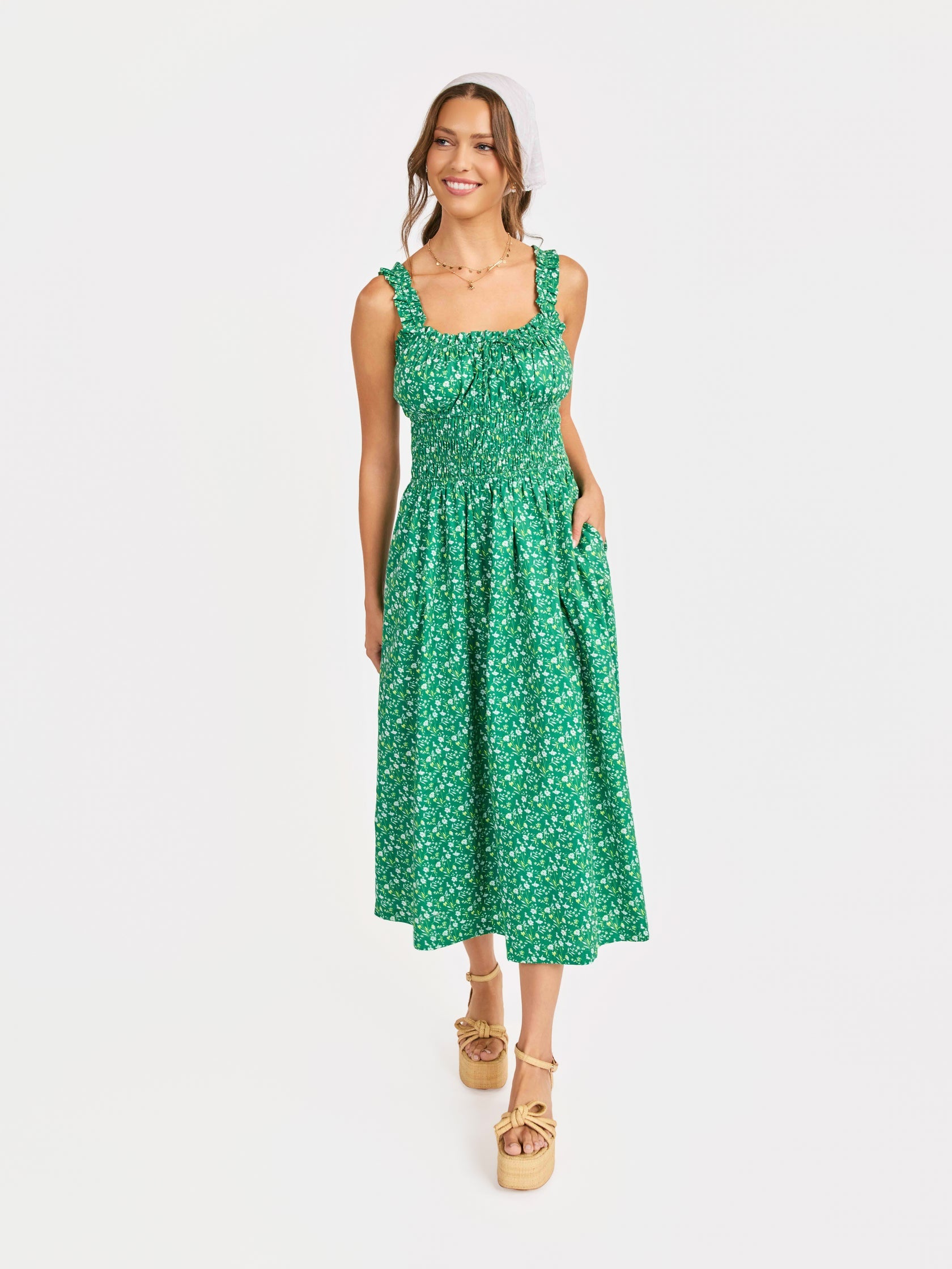 This Sun Escape Shirred Waist Midi Dress features a vibrant, cottagecore-inspired silhouette with a ditsy floral print that brings a fresh, effortless energy to your warm-weather wardrobe. The smocked bodice and tiered-effect skirt create a flattering, feminine shape that is as comfortable as it is stylish.