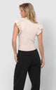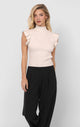 Elevate your work attire with the Tiffany Mock Neck Ruffle Tank Sweater. Crafted in a cream color with a high mock neck and ribbed fabric, this sweater exudes elegance. The ruffle statement short sleeves add a touch of sophistication, making it the perfect piece to dress up for work.
