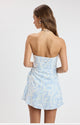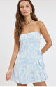 Strapless wrap-style mini dress in a pastel geometric print