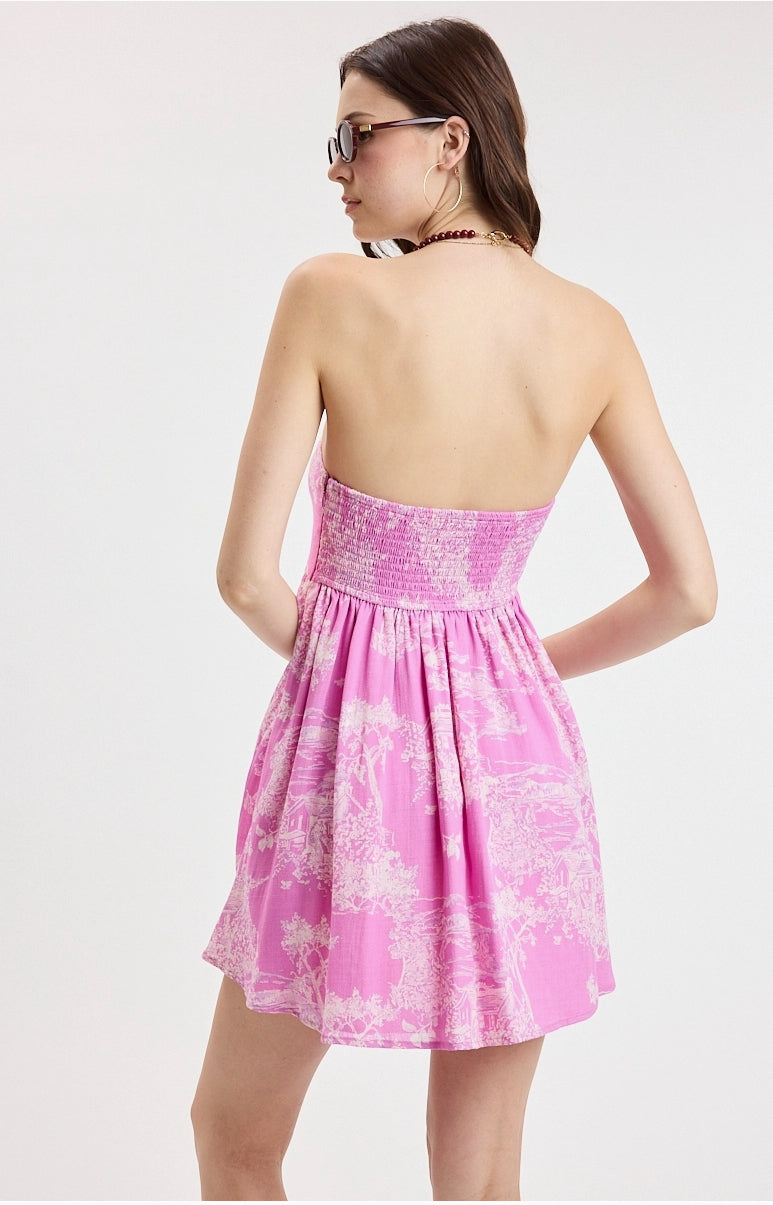 Strapless swing mini dress featuring a forest lodge graphic print and ruffle detailing