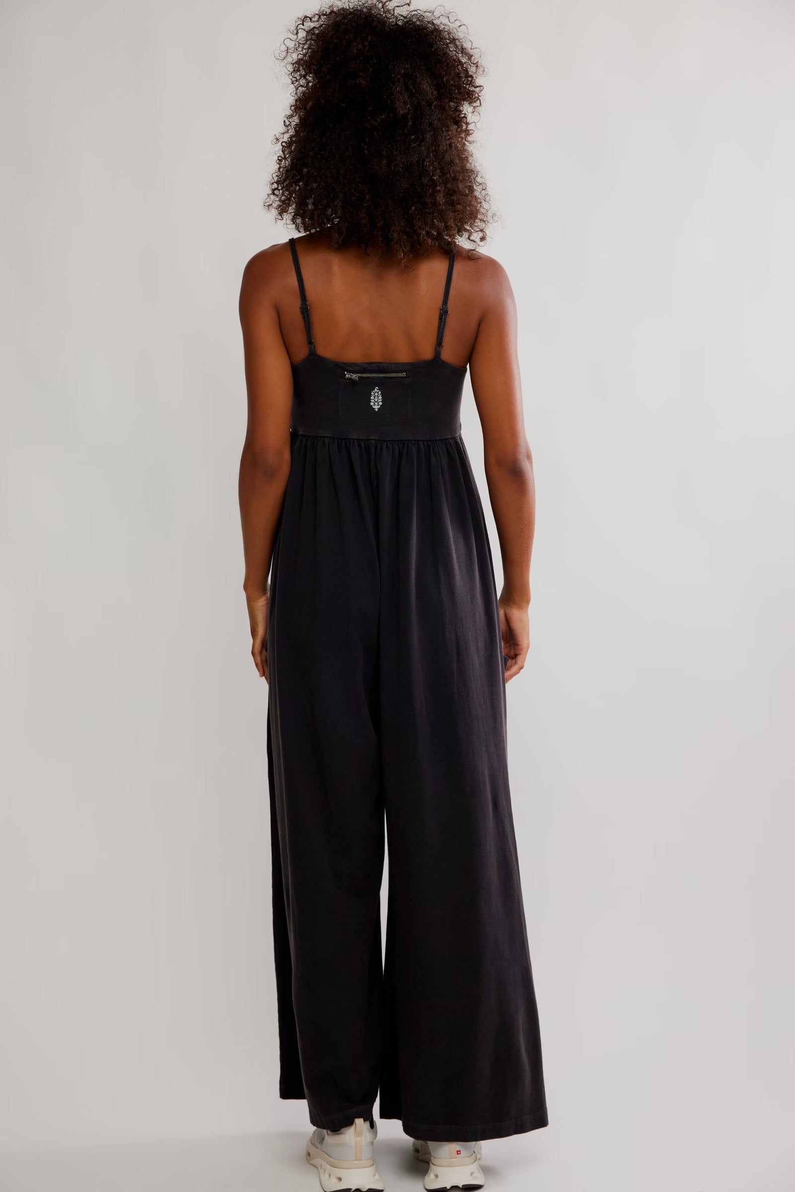 Features: Pull-on silhouette; slightly fitted, square-neck bodice; adjustable, spaghetti-style straps; pleated detailing at empire waist; slouchy patch pockets; oversized, wide legs; zipped logo pocket at back.