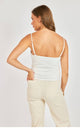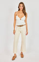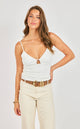 The Dearly Cutout Cami in Ivory features a V-neck and spaghetti straps, ensuring enhanced breathability and comfort. The front keyhole design adds a contemporary aesthetic, while the cropped length allows for versatile styling with denim pants or skirts. This top is ideal for layering or standalone wear, adapting to various occasions.