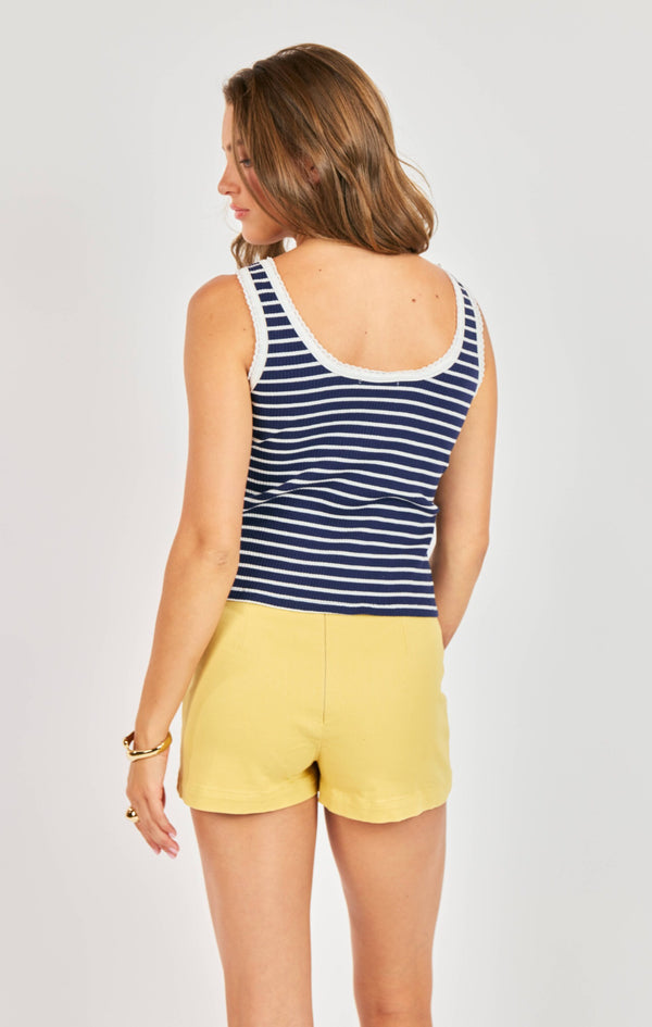 The Dejavu Stripe Tank features a rounded neckline and delicate lace trims, enhancing its aesthetic appeal. Constructed with a ribbed fabric in navy and ivory stripes, this tank combines style and comfort, making it suitable for various occasions. The design promotes breathability and a flattering fit.
