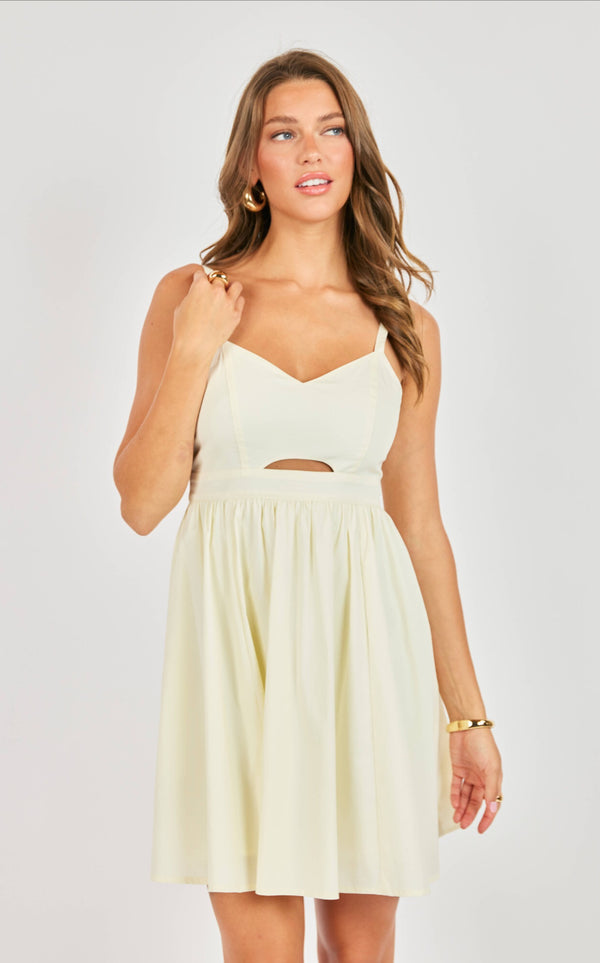 The Shades On Cutout Mini Dress in Ivory features a V-neck design and a sleeveless cut, ensuring breathability and ease of movement. The A-line silhouette flatters various body types, while the cutout under the bust adds a contemporary touch. The flowy skirt enhances comfort and versatility for diverse occasions.