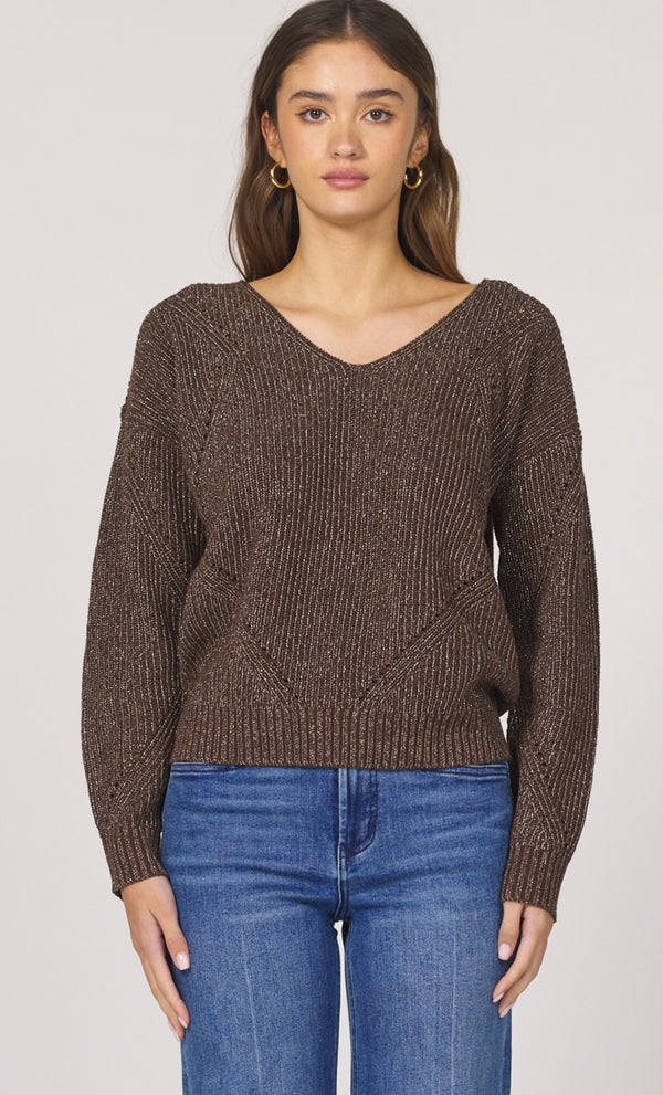 Camilla v-neck in long sleeve lurex yarn sweater, crafted from 100% cotton for a soft touch and breathable comfort.
