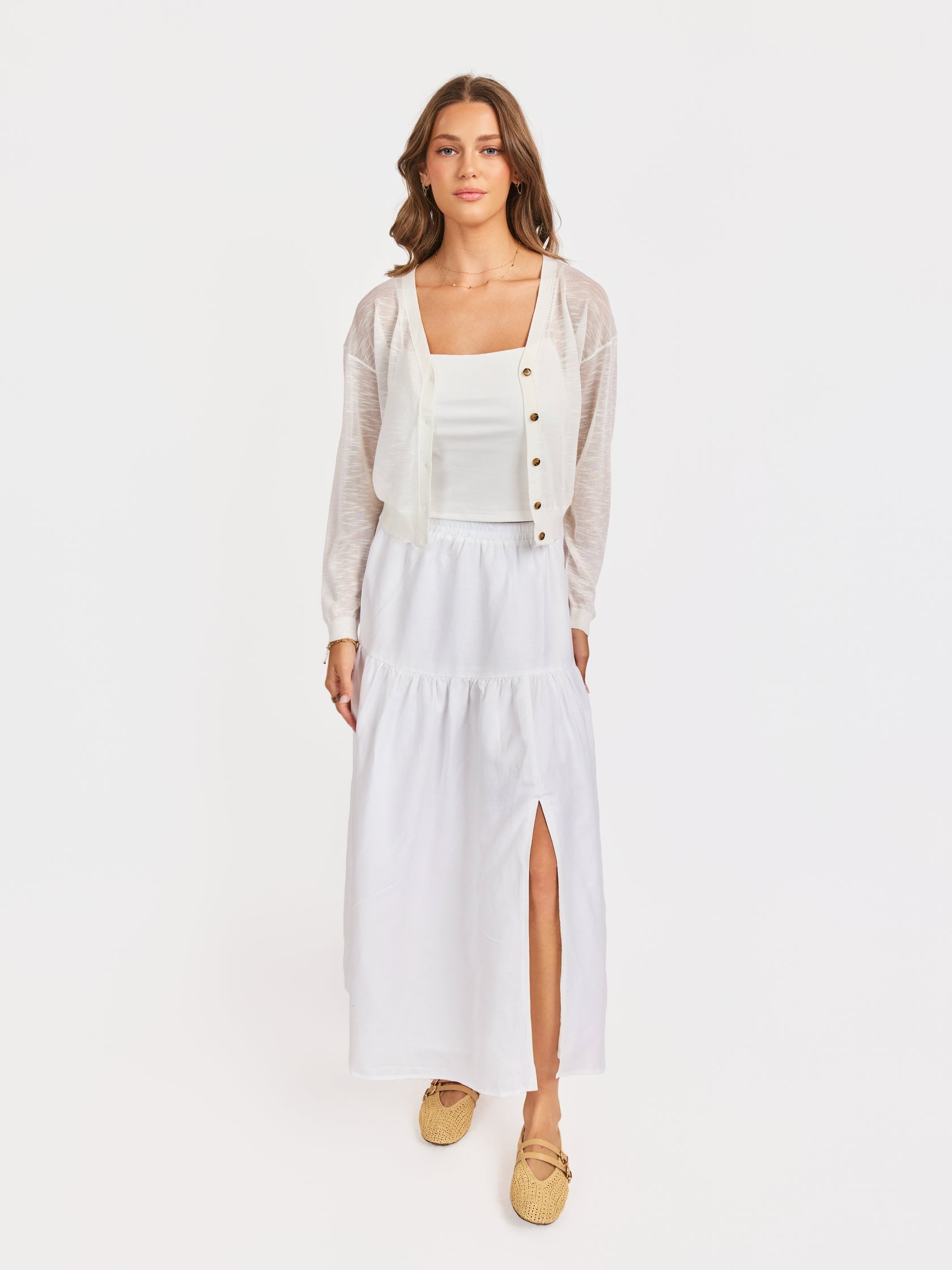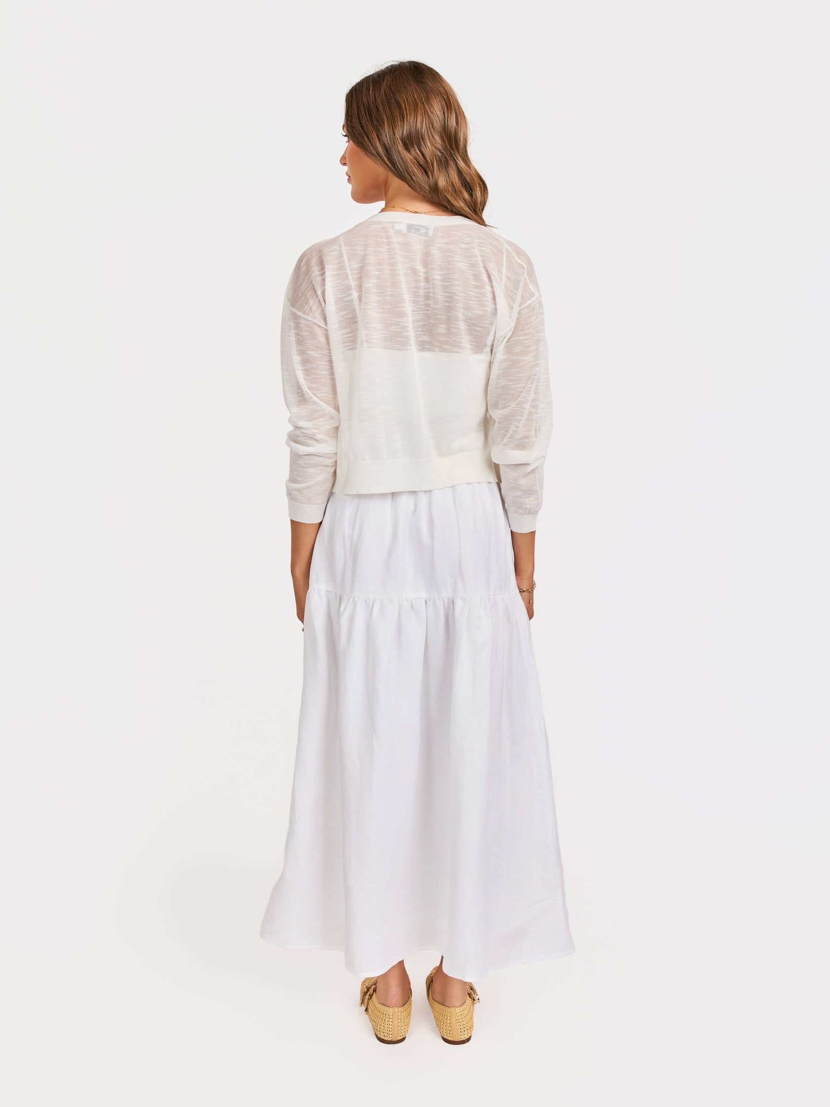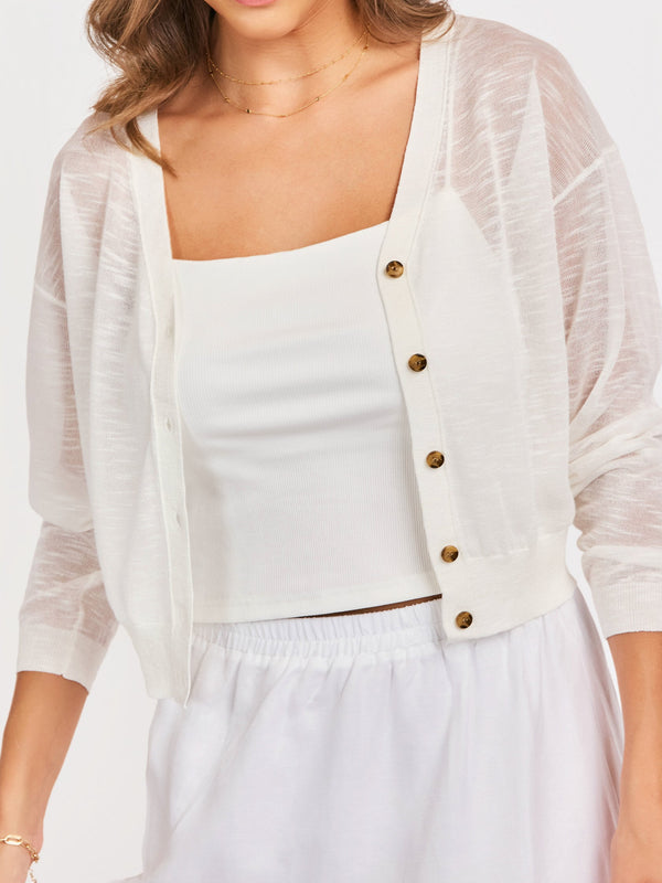 - Tortoiseshell Button Detail – Contrast buttoning adds a touch of classic, grounded style to the airy white knit.