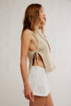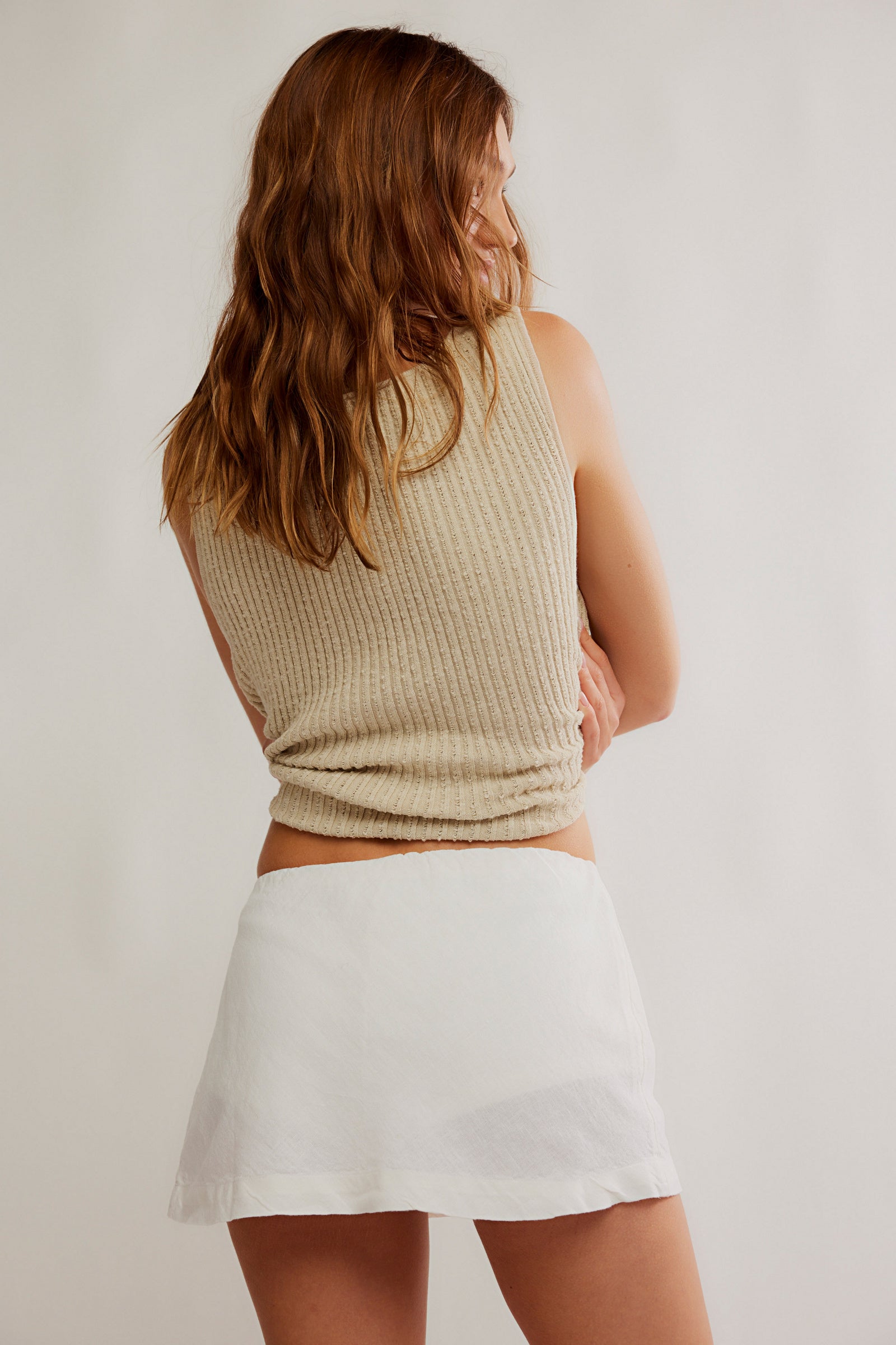 The Free People My Little Micro Mini skort features a low-slung, relaxed fit with a pull-on design, crafted from a soft linen/cotton blend. It includes an intentional exposed seam detail for a stylish look. The shorts lining is designed to lay flat, enhancing comfort and versatility for various seasonal outfits.