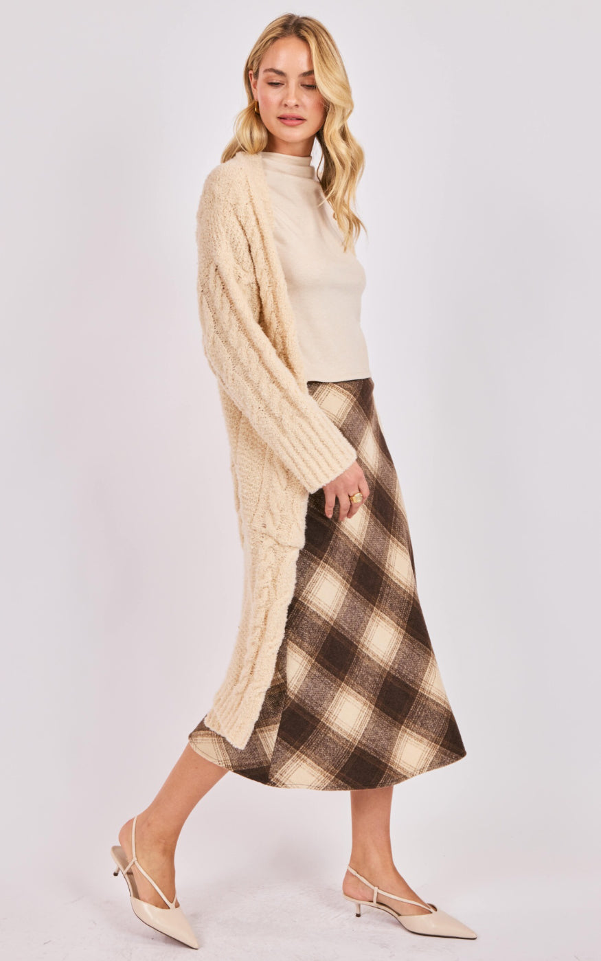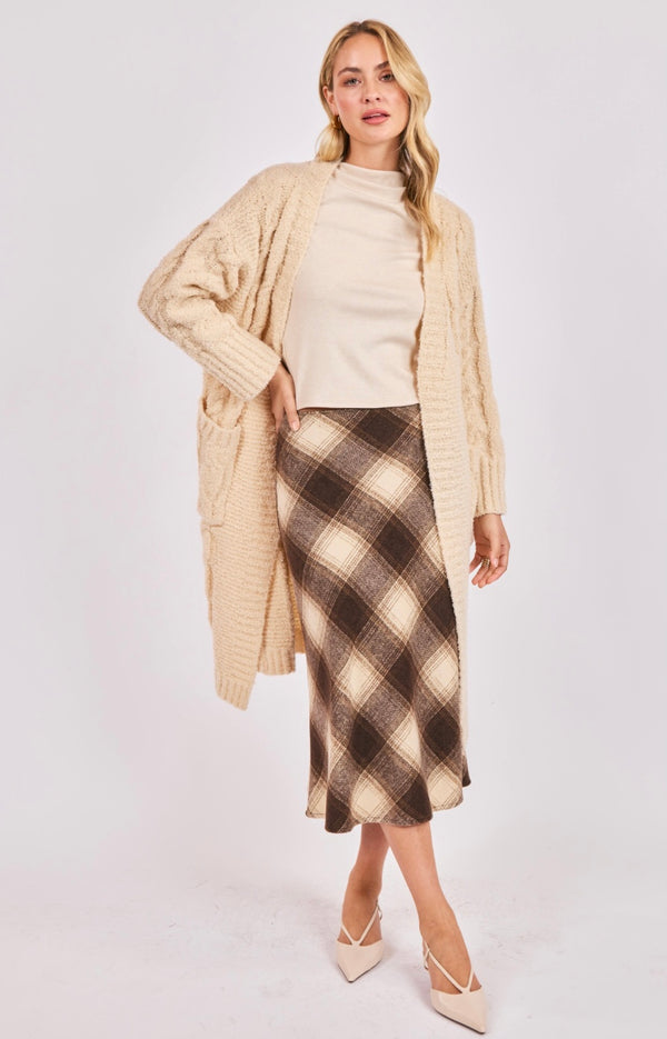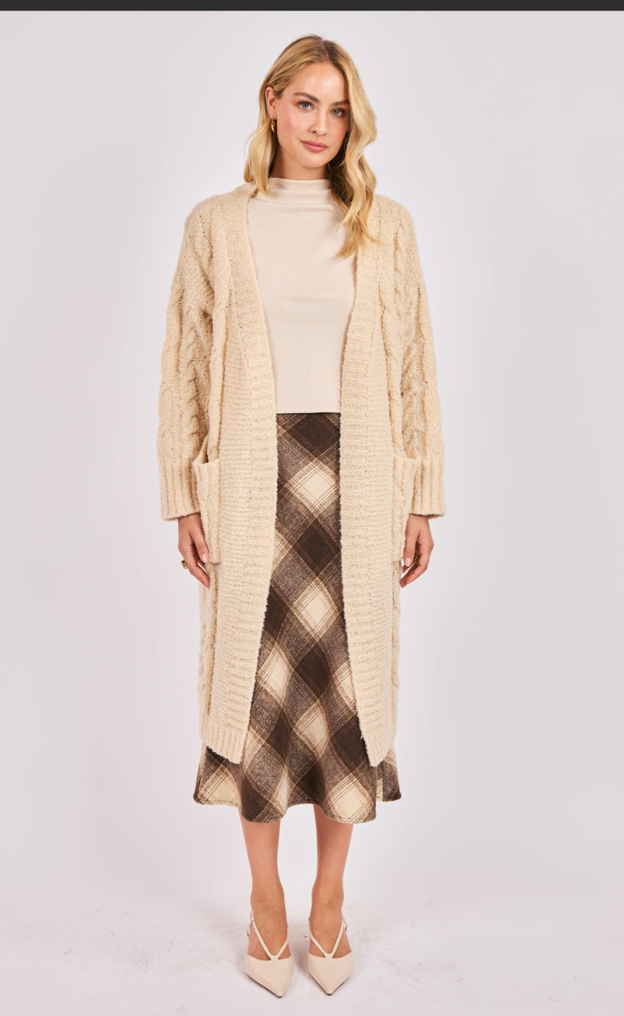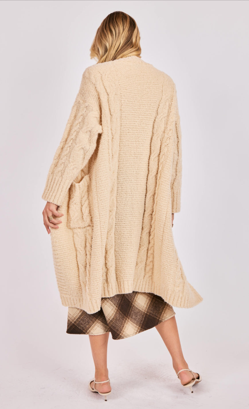 Crafted for comfort and style, the Lenora Open Front Duster Cardi is the perfect addition to your wardrobe. The cream color and soft knit design provide a cozy, yet sophisticated look. With its long length and front pockets, this cardigan is both practical and chic. Model is 5’10” for reference.