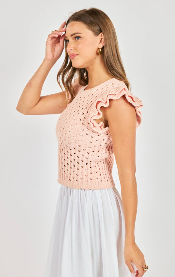 Made for sunshine days and gentle layers, the Miren Sweater blends sweet details with a soft feel. Featuring ruffled flutter sleeves and an airy open stitch design, it’s a romantic piece that still feels easy to wear.