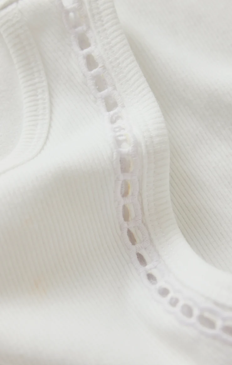 A lightweight, fine-rib cotton tank top with a classic crew neckline and delicate eyelet detailing along the edges. Easy, breathable, and feminine, this cotton top is an everyday staple made for warm days.